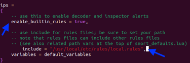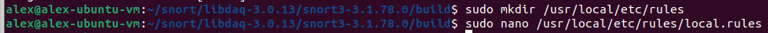 Step 11. Modifying Snort configuration so user (me) does not have to specify the rule locations when running Snort. Edited with "sudo nano /usr/local/etc/snort/snort.lua"