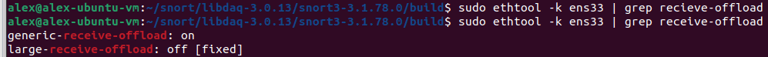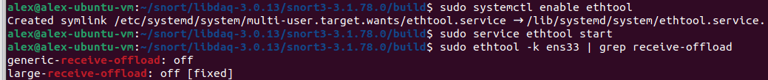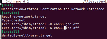 Step 9. Turning off Generic & Large receive offloads (GRO/LRO) on network card using a service. Finding network adapter name using "ip a" - ens33.