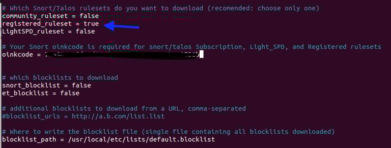Step 13. Modifying Pulled Pork .conf files - Set registered_ruleset = true, entered Oinkcode, commented out blocklist_path, and enabled both local_rules & snort_path