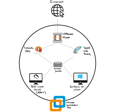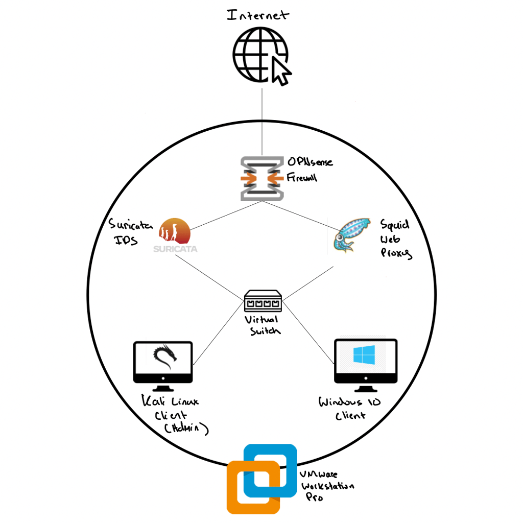 In this blog post I will be creating a virtual network simulating real world enterprise security needs. I will be using many tools; OPNSense, Virtual Switches, Suricata, and Squid to achieve the end goal of network engineering and management.