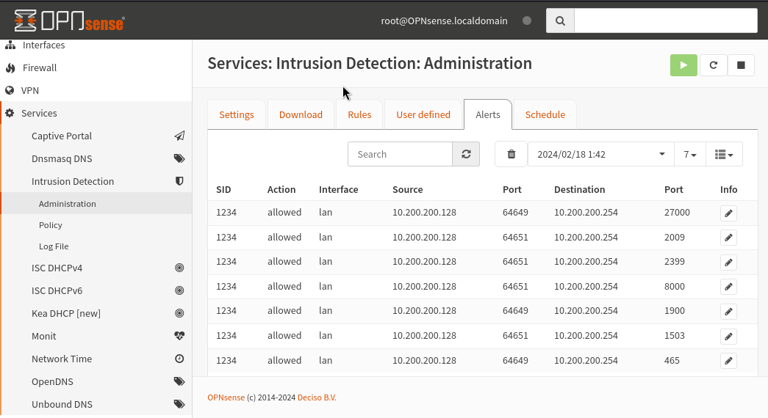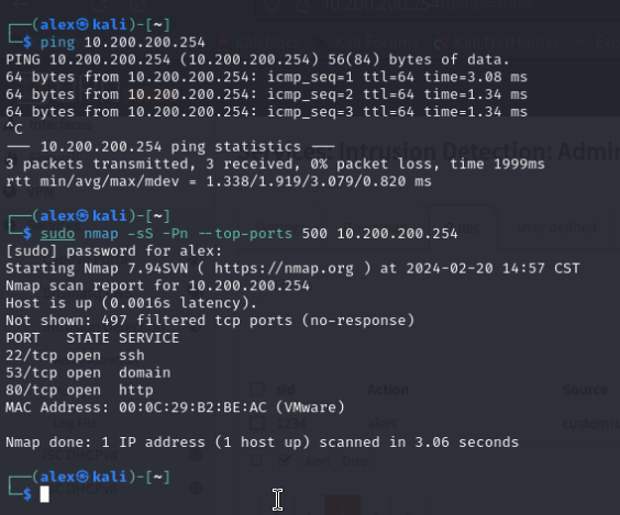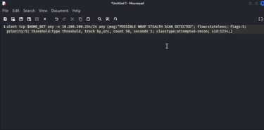 Suricata will alert to any TCP traffic from our LAN segment inbound to the firewall on any port with the message "POSSIBLE NMAP STEALTH SCAN DETECTED."