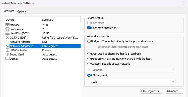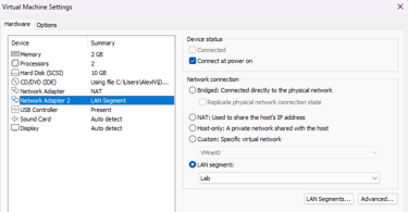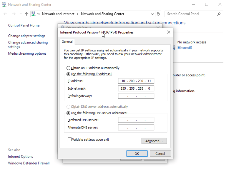 Setting single NIC on Windows 10 machine to private LAN segment, then statically assigning an IPv4 address of 10.200.200.11 on VM. Also changing Kali IP to 10.200.200.10 to be less confusing.