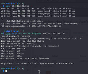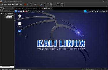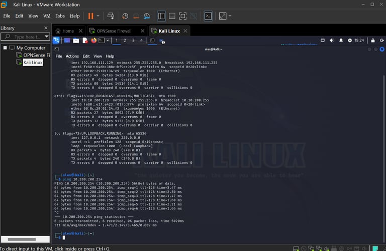 Connectivity is up, showed by pinging the firewall from the Kali machine.