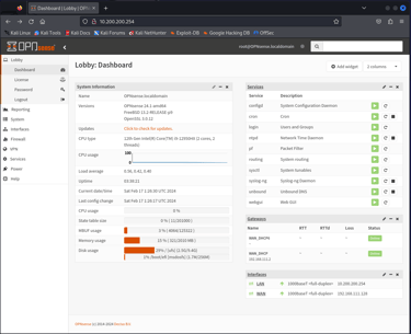 OPNsense's WebGUI, accessed from the Kali machine at http://10.200.200.254:80