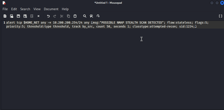 count 50 seconds 1 (50 SYN packets sent in 1 second will trigger the alert)