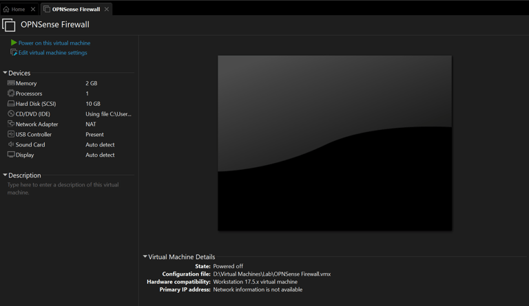 The initial configuration of the newly installed OPNsense firewall. Adding another network adapter to use for my private LAN segment for 'client' devices.