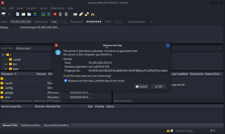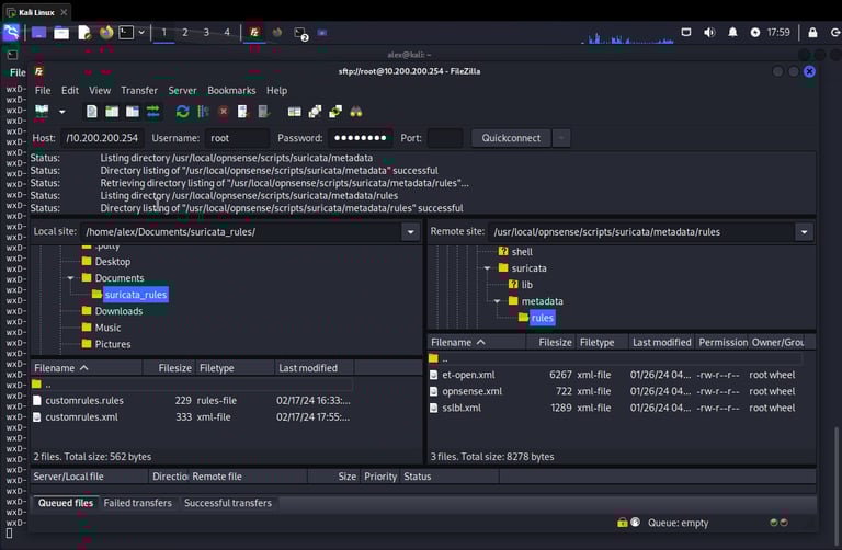 Installing Filezilla on the Kali machine, connecting to the firewall using SSH, transferring new rule files to OPNsense