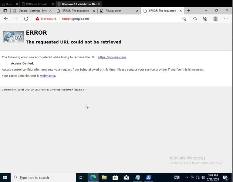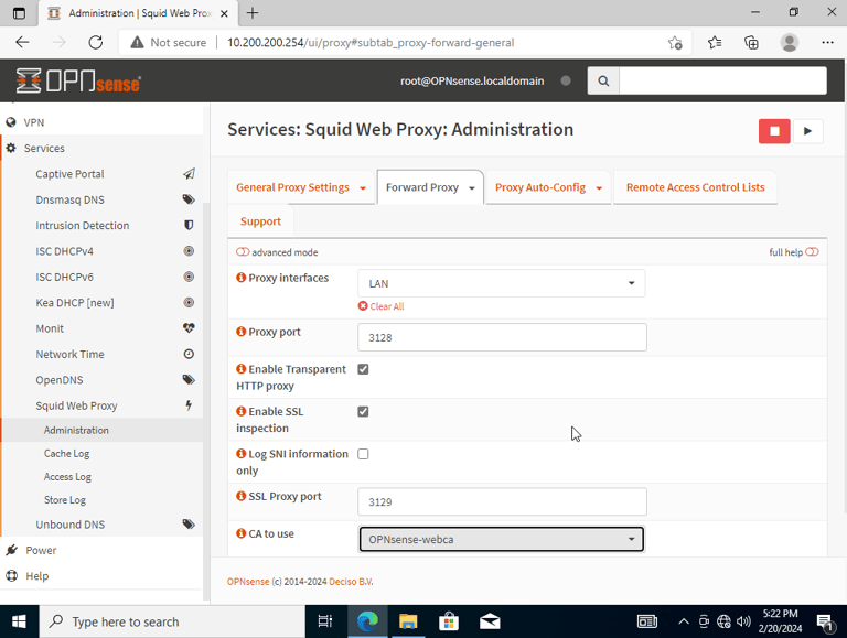 Connecting Windows 10 Client to LAN segment, downloading & enabling Squid Web Proxy, creating an Internal CA, installing CA on Windows 10 Machine.