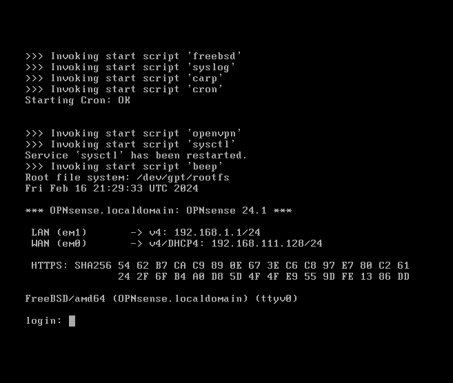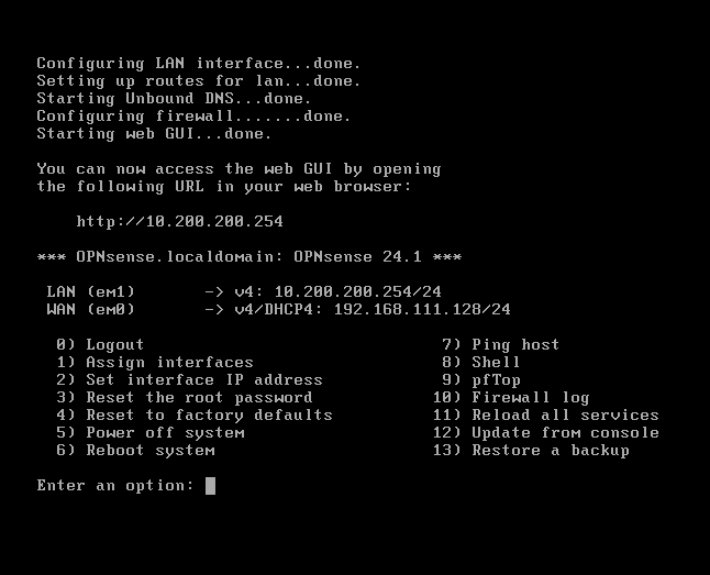 Creating private LAN segment, initializing OPNsense, assigning static IPv4, assigning firewall interfaces on the command line: