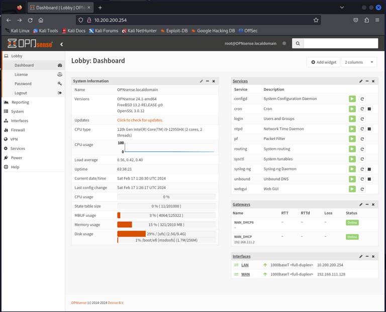 Disabled IPv6 for this lab, assigned a static IP of 10.200.200.254/24 to the LAN interface, reset root password and changed WebGUI access from HTTPS to HTTP just for labbing purposes.