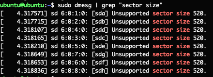 My next step in this crazy fun saga, was reading page upon page of online forums to figure out a few more possible causes, specifically a drive being previously used and formatted with 520 Byte sector sizes. But, the catch was that even though I was confident I knew the issue, I was still not able to see the drives to reformat them. I even tried installing Ubuntu on a live USB, but Ubuntu was not able to see the drives either.